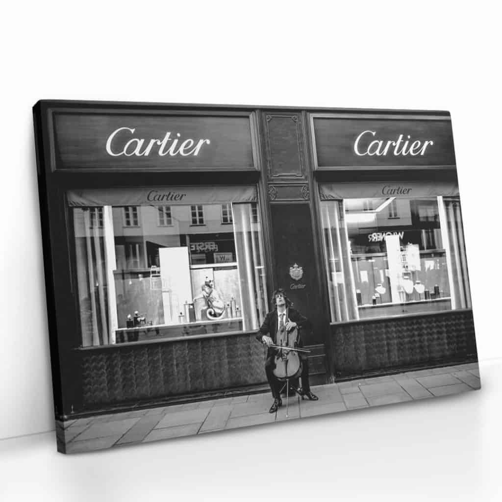 Bij het 'Cello Player' design zie je iemand die de cello speelt voor een Cartier winkel. Door deze elementen en het gebruik van zwart-wit krijgt dit schilderij een luxe vintage uitstraling. Ideaal dus voor in jouw woonkamer of slaapkamer!