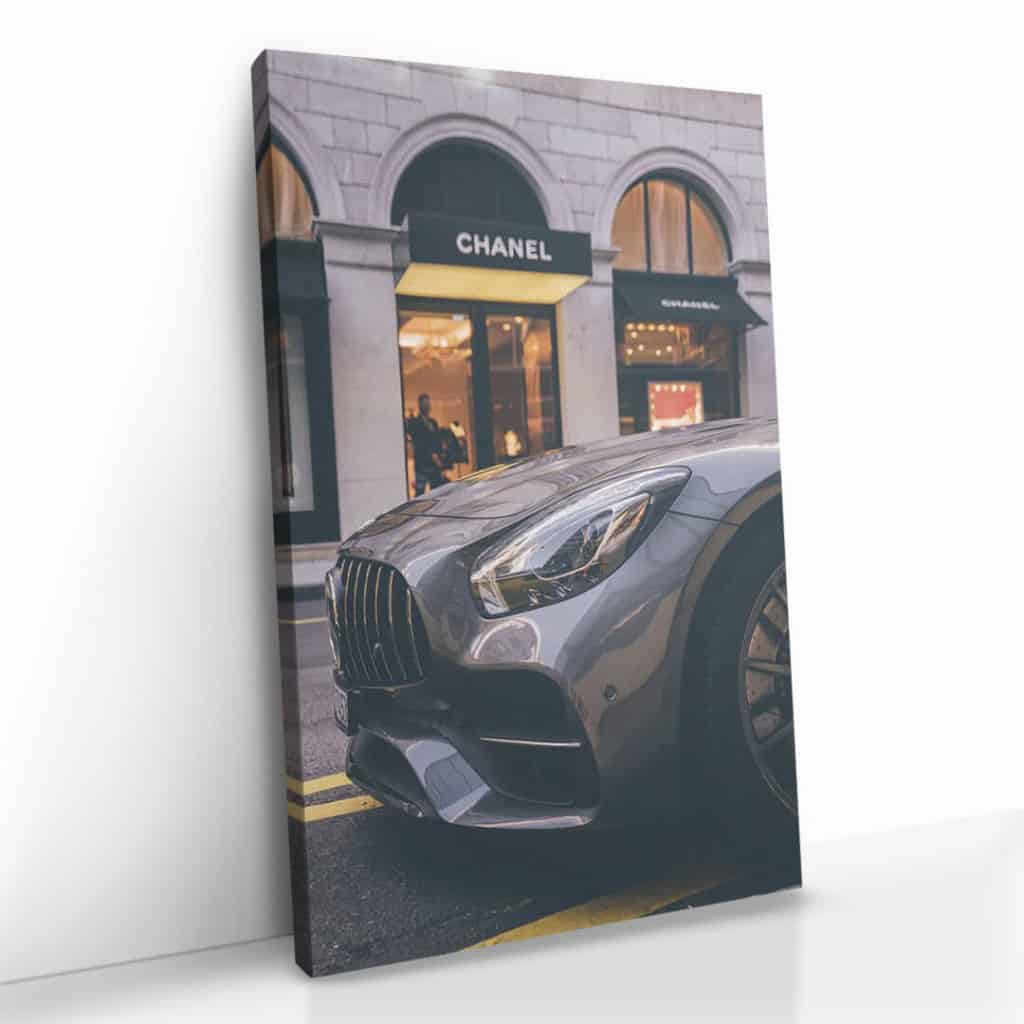 Met het design 'Parked in Style' haal je gemakkelijk een luxe sfeer in je huis! Je ziet een dure Mercedes auto staan voor een Chanel winkel. Door deze twee elementen krijgt dit schilderij een luxe en high-end uitstraling!