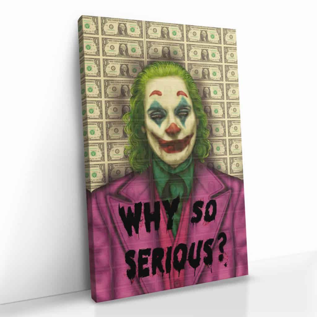 The Joker' is een design met een leuke twist. Ben jij veel bezig met succes en vind jij het leuk om dit op een grappige manier terug te laten komen in jouw interieur? Dan is dit schilderij echt iets voor jou! Je ziet hier de Joker en op de achtergrond geld biljetten. En natuurlijk de Quote: " Why So Serious" geeft de finishing touch voor dit unieke design.